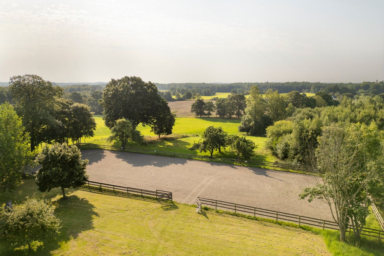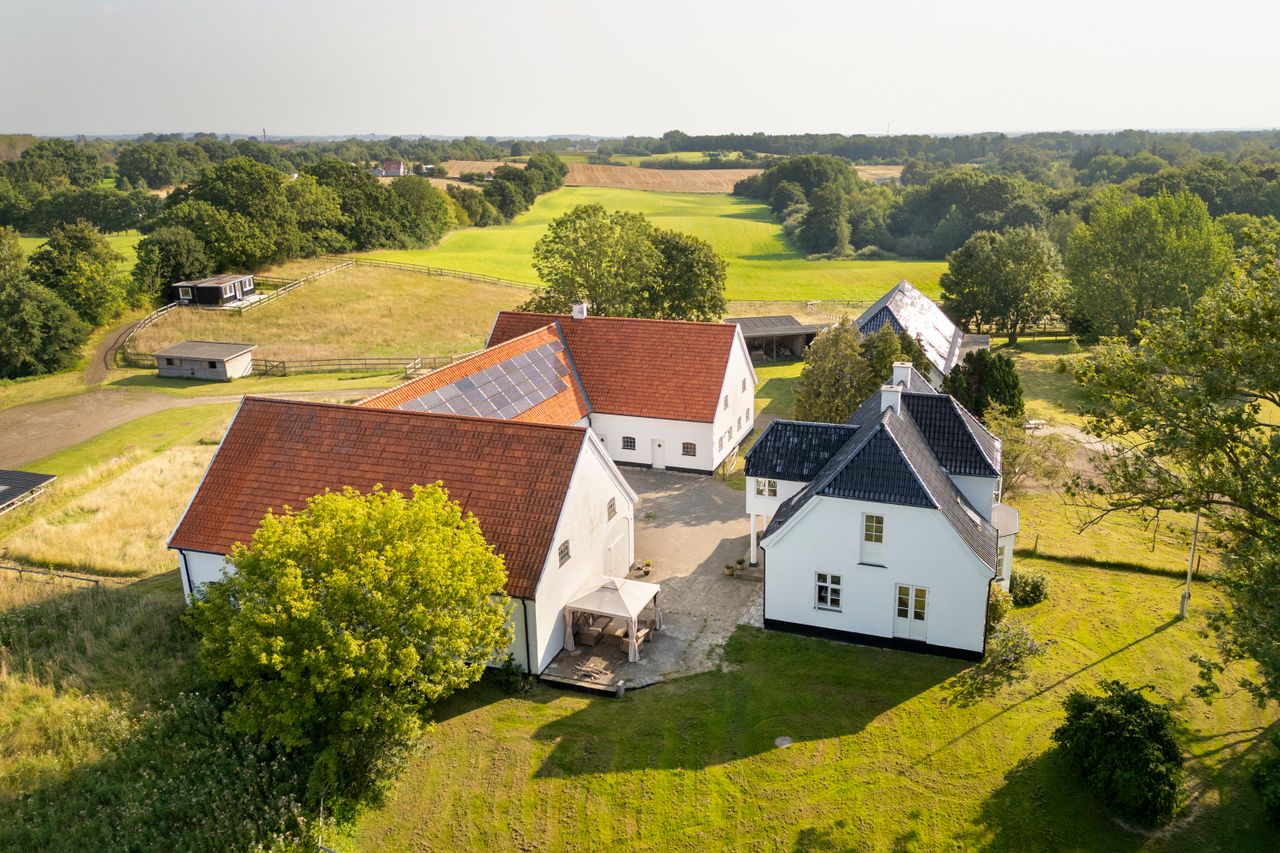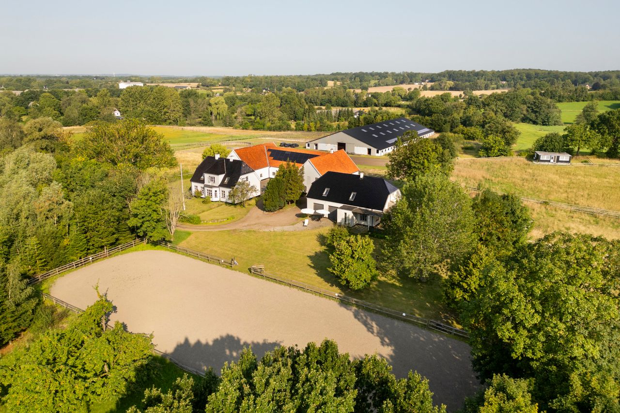 En drøm af en privat beliggende landejendom midt i et kuperet og naturskønt område og med et jordtilliggende på lidt under 20 hektar. Ydermere med et hesteafsnit, der er helt i top, flere boliger og medarbejderbolig. Man bydes velkommen via port til en smukt anlagt allé med opdelt indkørsel til henholdsvis den private afdeling samt hesteafsnittet. Et klassisk hvidpudset stuehus med sprossede vinduer og sortglaseret tegl. Opført i 1928 og indeholdende 179 boligkvadratmeter. Separat beliggende bolig to, ligeledes opført i 1928/2004 og indeholdende 180 boligkvadratmeter. Fra begge boliger de mest vidunderlige udsigter over egne jorde, folde og ridebane. Ydermere en godkendt medarbejderbolig på 56 m2 i nær tilknytning til stalden.