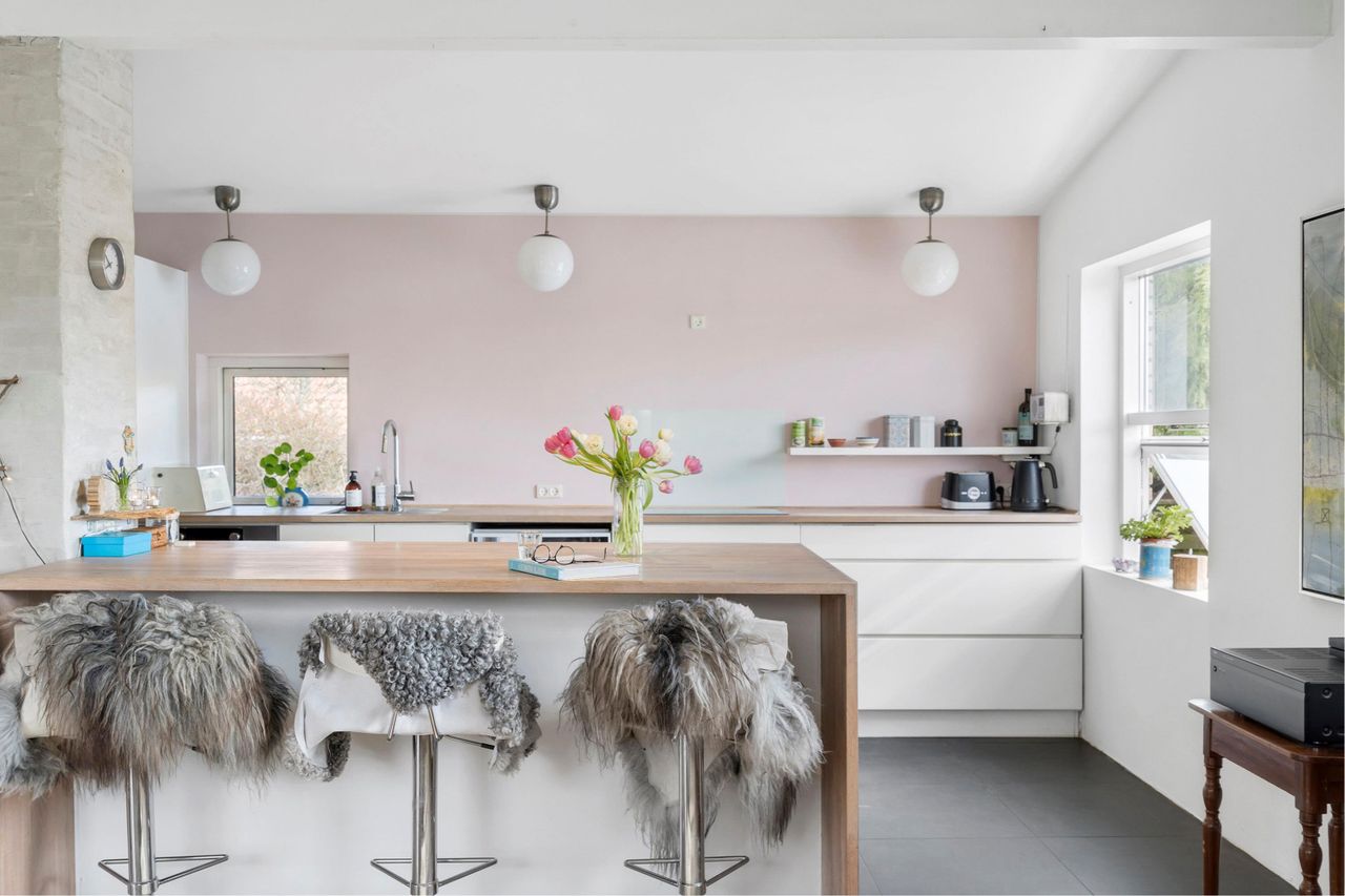 er er i det delvist åbne køkken til stuen med brændeovn og udgang til terrassen og haven.